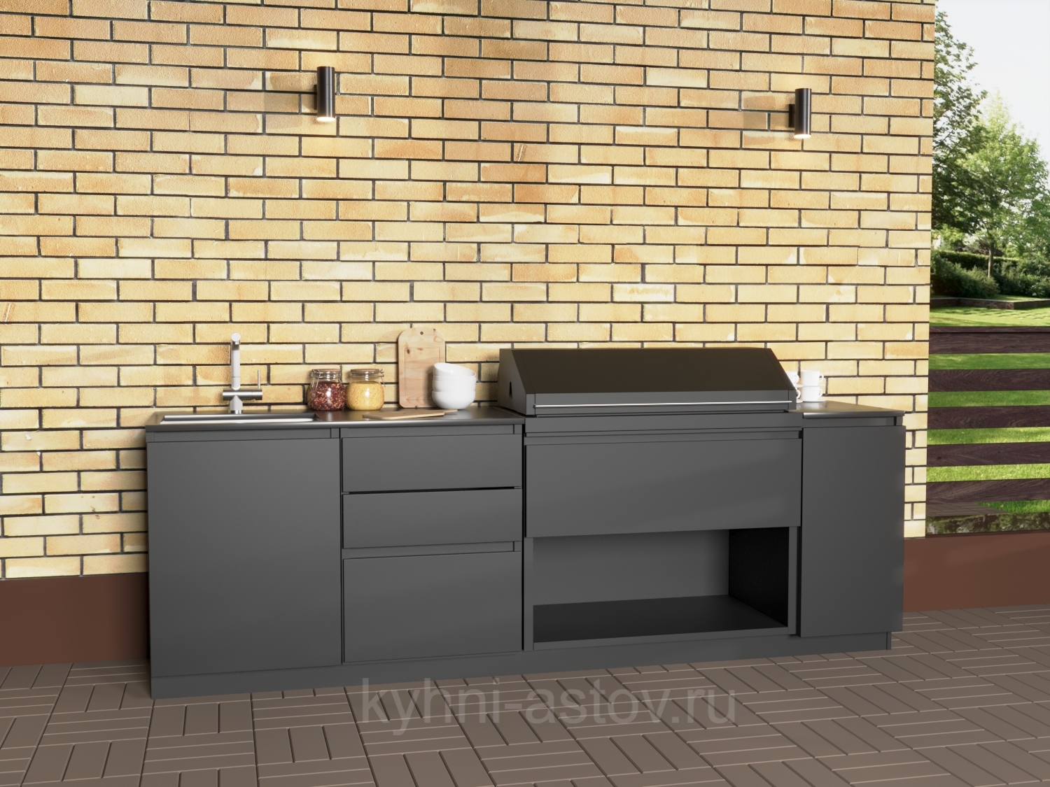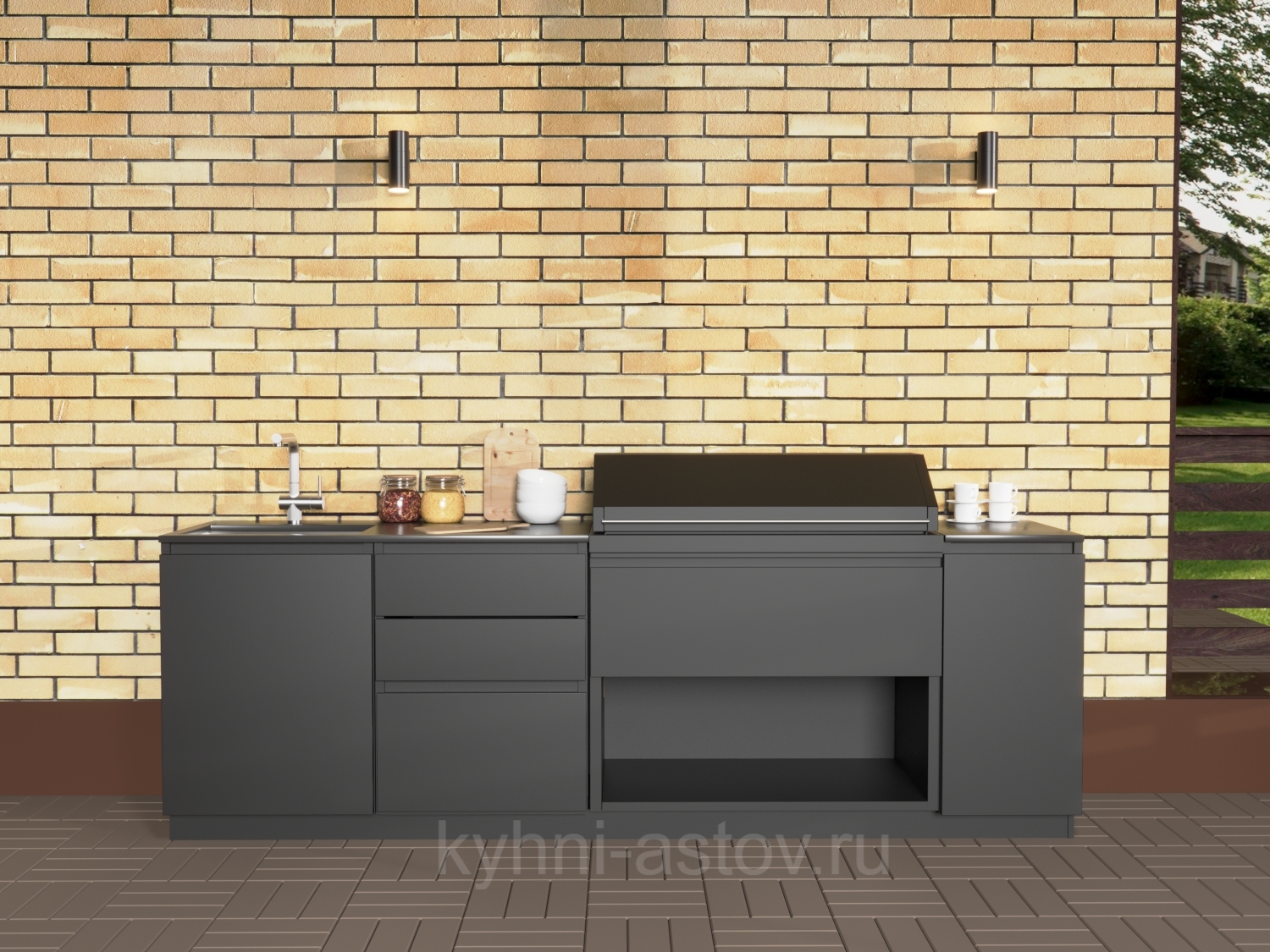 Корпус и фасады выполнены из оцинкованной стали толщиной 1 мм. Фасады двухконтурные с шумоизоляцией. Корпус, фасады, вытяжной зонт покрашен порошковой краской в 2 слоя, цвет: RAL9005. В комплектацию кухни Астов №7 вытяжной зонт не входит. Его можно заказать отдельно. Дополнительно можно установить: — Столешницу. — Мойку и смеситель. Барбекю-комплекс от АСТОВ – идеальное решение обустройства кухни из стали для улицы . Несмотря на компактность, здесь продумана каждая деталь. Покрытие корпуса из стальной оцинковки толщ. 1 мм производится порошковой краской цвета RAL9005 и гарантирует долговечность и устойчивость всех поверхностей даже при интенсивном использовании. Фасады комплекса оснащены шумоизоляцией. Базовый комплект включает модуль для мойки на 600 мм, модуль 600 мм с тремя ящиками для размещения столовых приборов и посуды, угольный гриль на 1000 мм и модуль для хранения с дверкой и полкой 400 мм. Цена зоны барбекю , как и предлагаемого комплекта с полным оснащением, будет отличаться в зависимости от того, какие дополнительные опции вы выберете (столешница, мойка, смеситель, наполнение тумб). Документация Размеры мойки