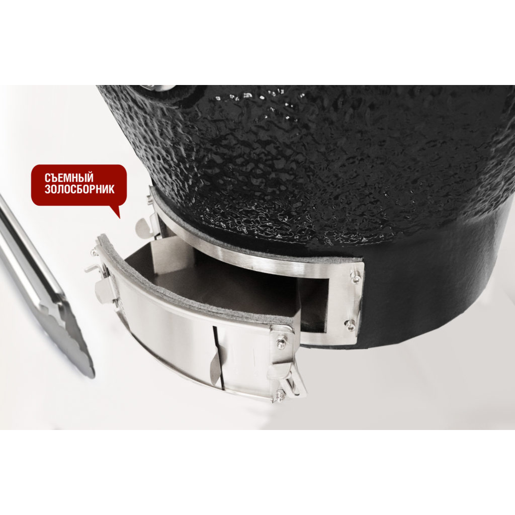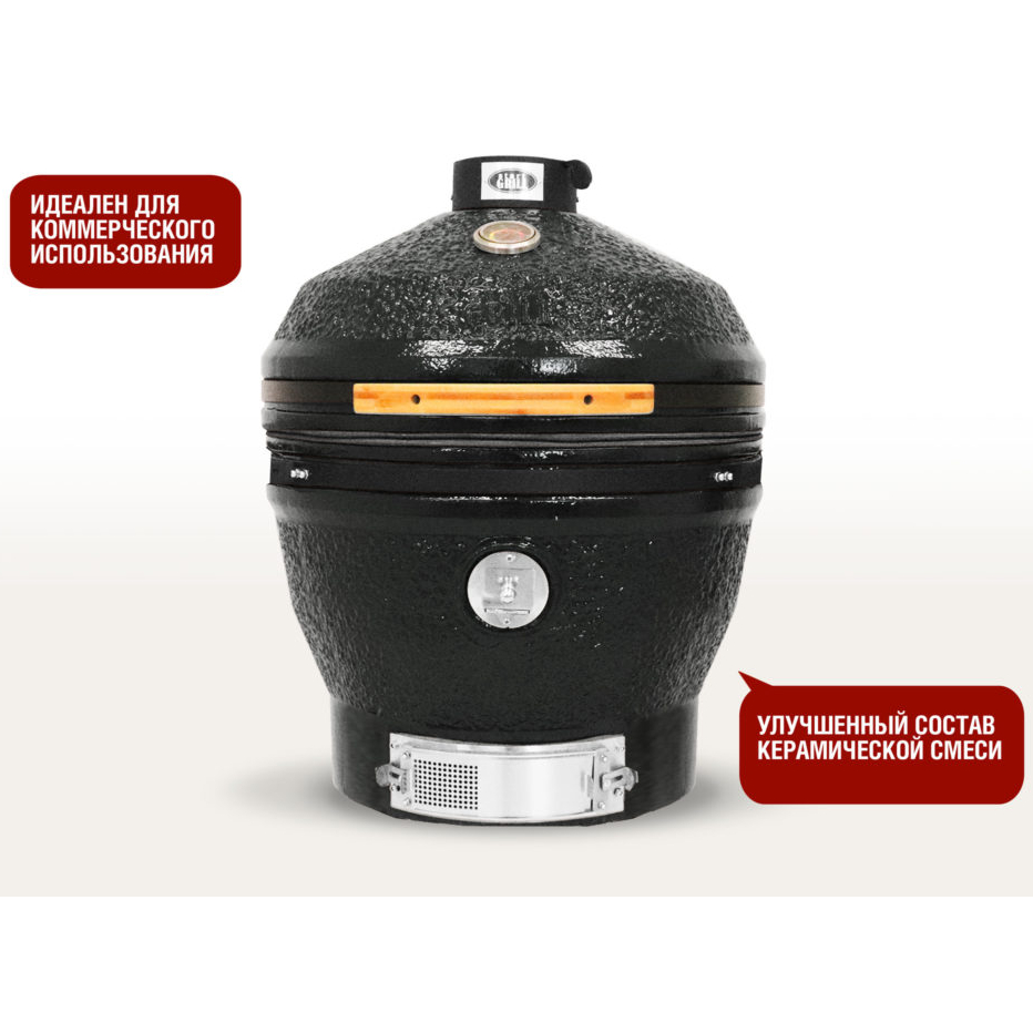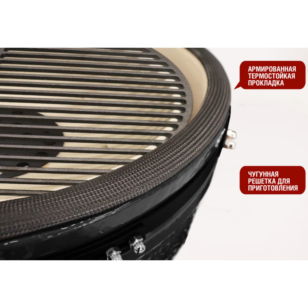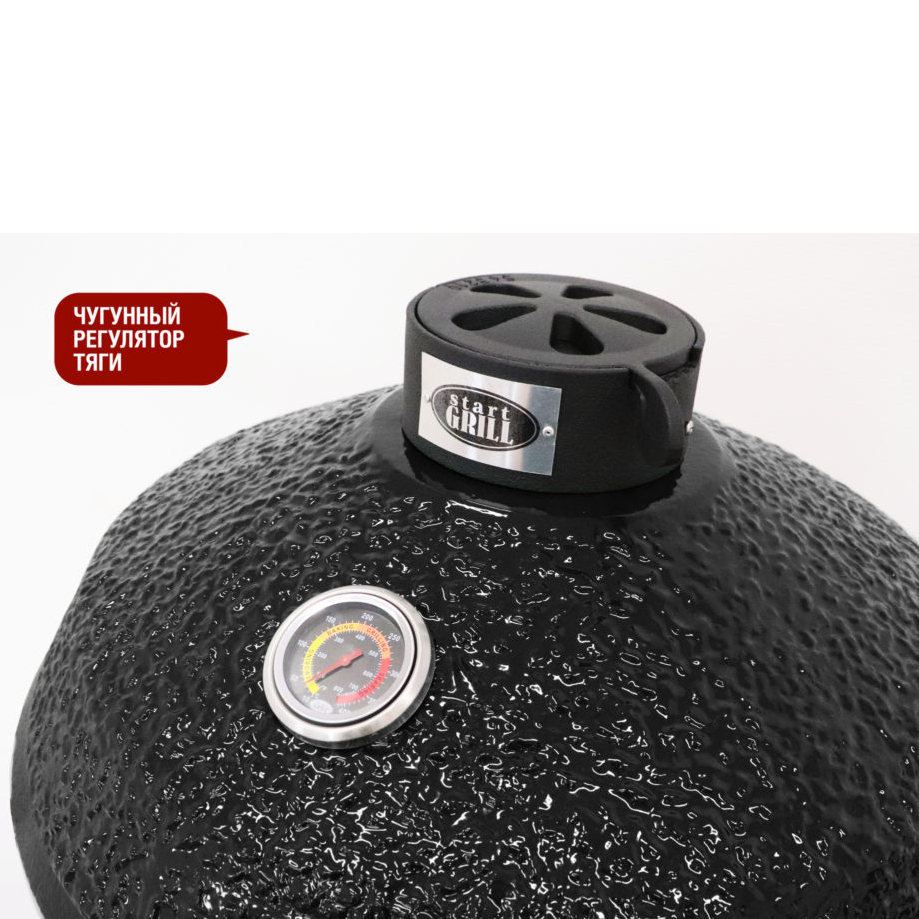 Керамический гриль Start Grill SG 24 CFG CHEF PRO (черный) относится к профессиональной линейке семейства керамических грилей Start Grill. Керамический гриль-барбекю 24 дюйма CFG CHEF PRO — специальная лимитированная серия керамический грилей серии CFG. Данная версия имеет все преимущества классической серии с учетом некоторых особенностей комплектации. Так, CFG CHEF PRO не комплектуется стандартной подставкой, в наборе отсутствуют боковые столики и чехол, а стандартный набор хромированных решеток заменен на чугунную решетку со съемной центральной вставкой. Start Grill SG 24 CFG CHEF PRO имеет в своем арсенале удобную и эффективную систему подачи щепы CFG. Эта система представляет собой открывающийся отсек в корпусе гриля, направляющий лоток и толкатель. Теперь нет необходимости убирать продукты с решетки для приготовления, снимать саму решетку, чтобы загрузить дополнительную порцию щепы. Система CFG позволяет добавить щепу за считанные секунды, не открывая крышки гриля. С выходом версии CFG CHEF PRO появилась опция по выбору подходящей комплектации для каждой конкретной сферы применения. Данная модель гриля подойдет многим, но акцент делается для профессионалов. Имея в базе большой размер, устройство подачи щепы, улучшенный состав керамики и чугунную решетку, этот гриль станет незаменимым инструментом для кейтеринга, баров, ресторанов и BBQ зон. Базовая комплектация: 1. Наименование: Керамический гриль-барбекю CFG CHEF, 61 см/24 дюйма (черный) 2. Размер: 61 см / 24″ 3. Толщина стенки: 20 мм / 24″ 4. Диаметр гриля: 610 мм 5. Высота корпуса: 760 мм 6. Вес нетто / брутто: 90 / 100 кг 7. Чугунная решетка для приготовления 8. Диаметр решетки для приготовления: 525 мм 9. Габариты упаковки: 800 х 700 х 720 мм 10. Размер в собранном виде: 650x650x760 мм 11. Материал обруча, кронштейна, тележки: сталь