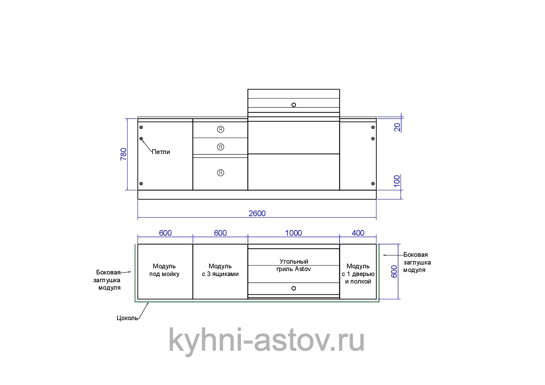 Корпус и фасады выполнены из оцинкованной стали толщиной 1 мм. Фасады двухконтурные с шумоизоляцией. Корпус, фасады, вытяжной зонт покрашен порошковой краской в 2 слоя, цвет: RAL9005. В комплектацию кухни Астов №7 вытяжной зонт не входит. Его можно заказать отдельно. Дополнительно можно установить: — Столешницу. — Мойку и смеситель. Готовым решением для создания зоны отдыха с высоким уровнем комфорта является уличная кухня нашего производства — № 57. При изготовлении корпуса и фасадов этого комплекта применена миллиметровая оцинкованная сталь. Именно она гарантирует долговечность и сопротивляемость к воздействию погодных условий. Фасады в 2-контурном исполнении, с прокладкой шумоизоляции – все продумано и идеально. Дополнительная защита реализована 2-слойной порошковой краской цвета RAL9005. Такое же покрытие у корпусов тумб и вытяжки. Как и у любой другой композиции, например зоны барбекю из металла , в наличии опциональное оснащение – столешница и мойка со смесителем. Их необходимо выбрать. Документация Размеры мойки