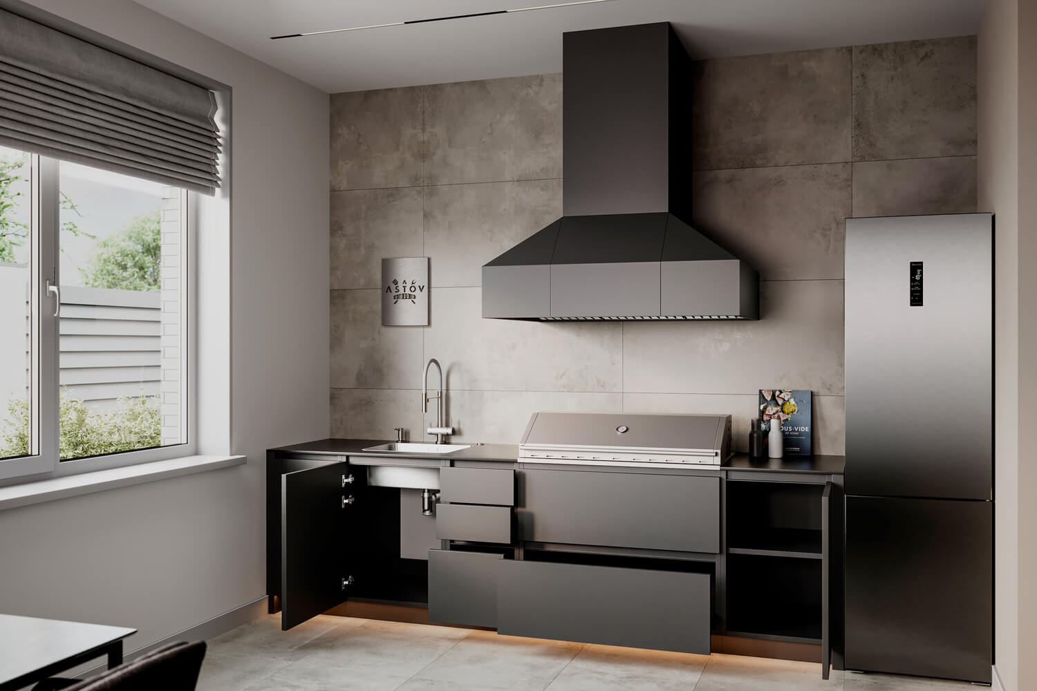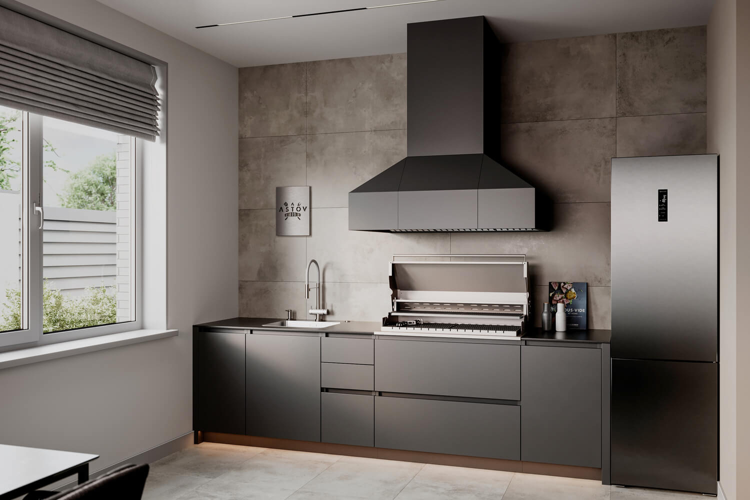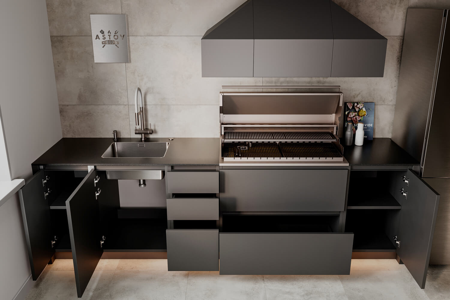 Функциональная и удобная металлическая кухня Astov BBQ для любителей стильного внешнего вида и готовить на угольном гриле. Наш гриль собственного производства позволяет с удобством приготовить различные блюда от простейших сосисок до сложной рваной текстуры различного мяса длительного томления.