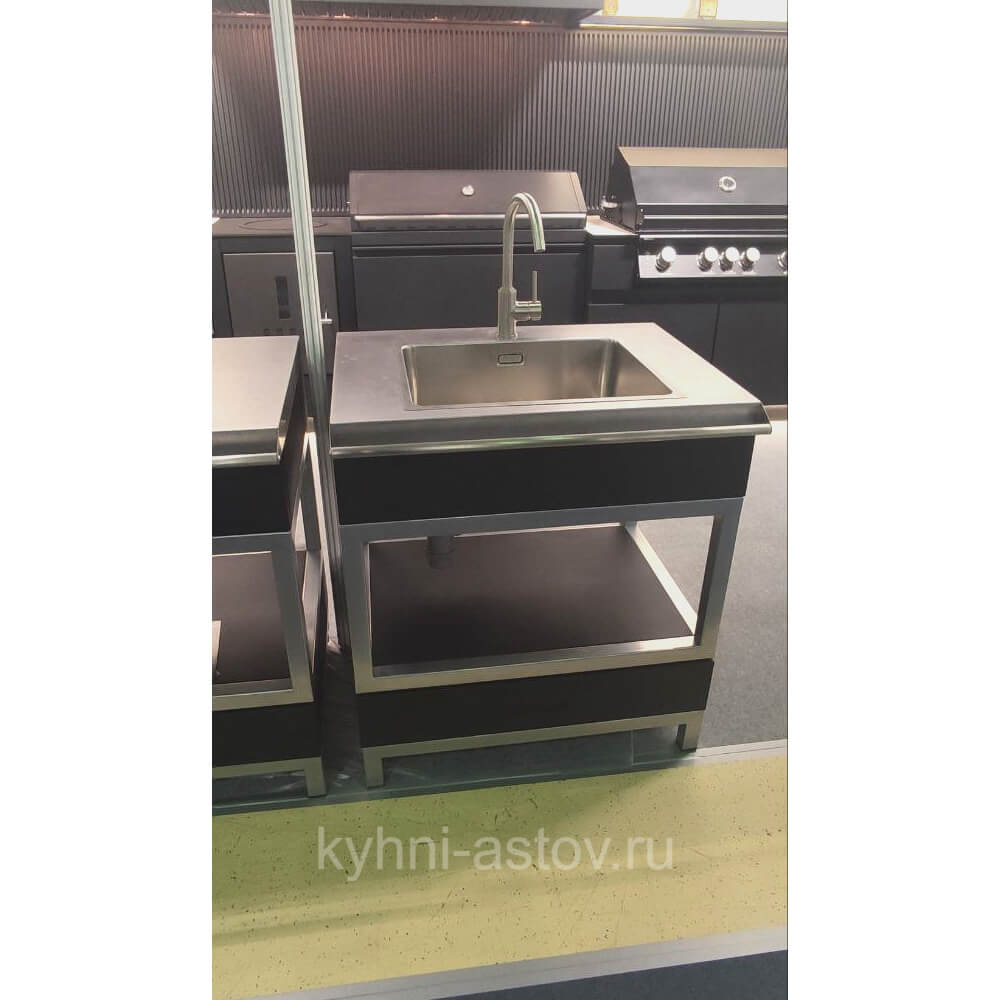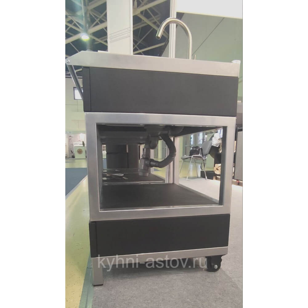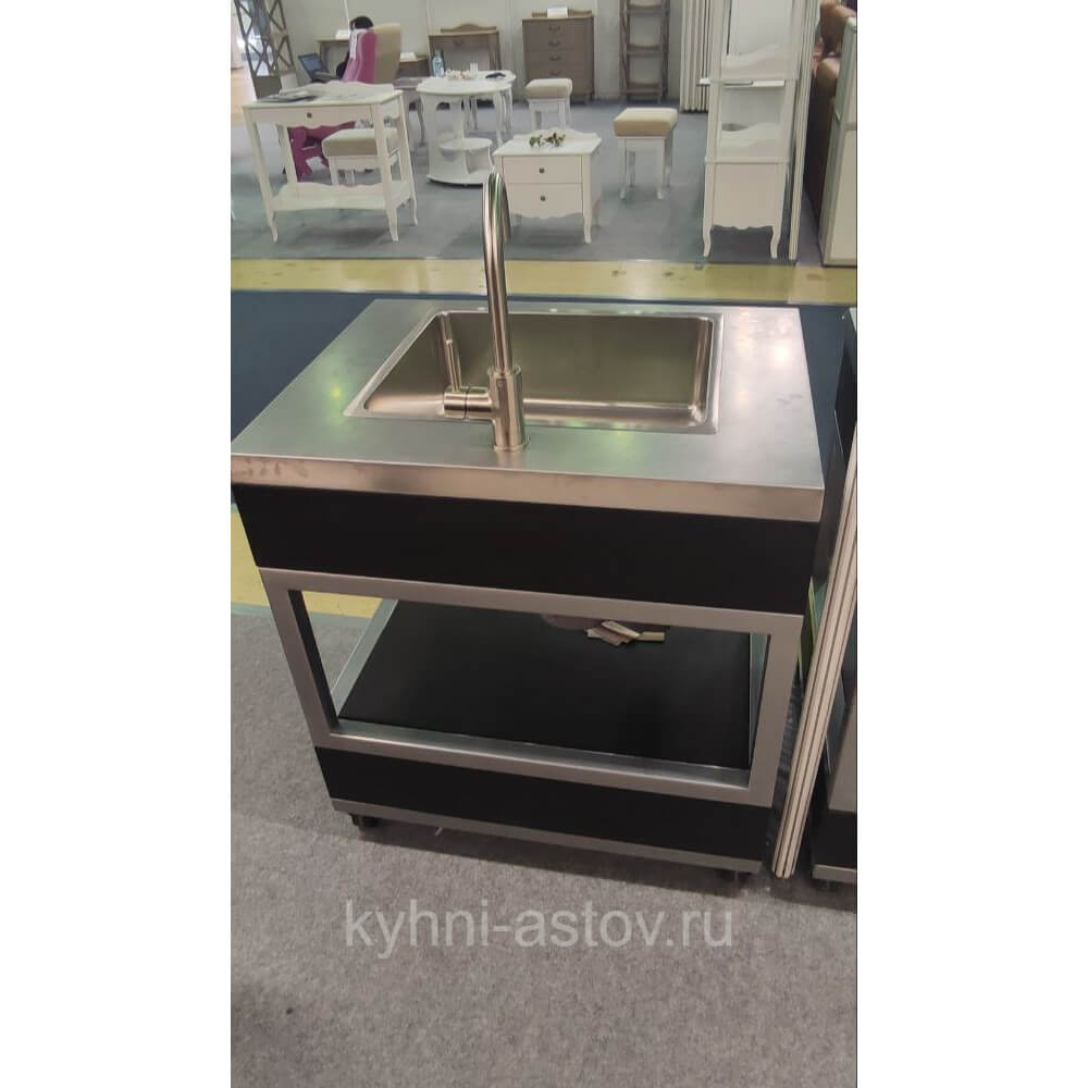 Материал корпуса – комбинированный: черный металл + нержавеющая сталь. Каркас покрашен порошковой краской с эффектом полированной нержавеющей стали. Столешница: брашированная нержавеющая сталь. Мойка накладная Смеситель и мойка не входят в комплект!