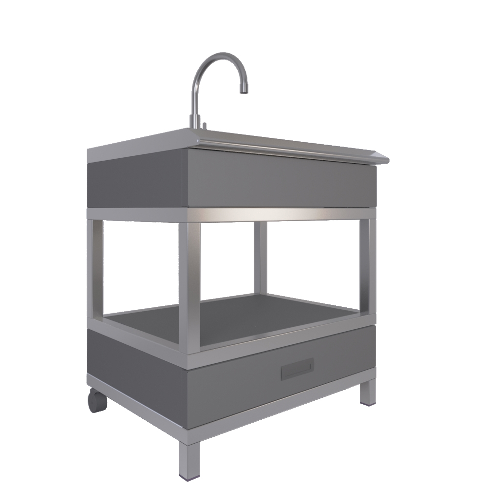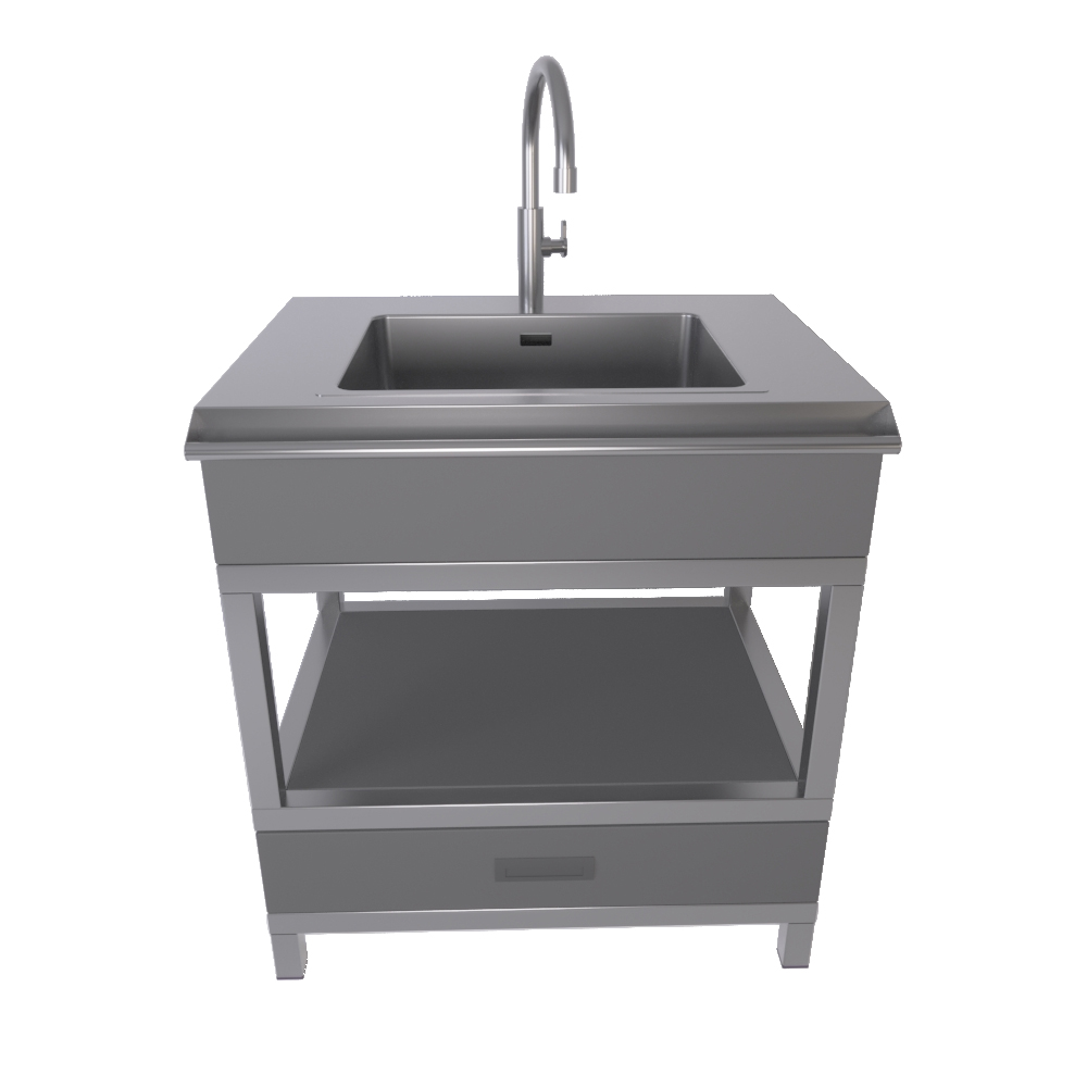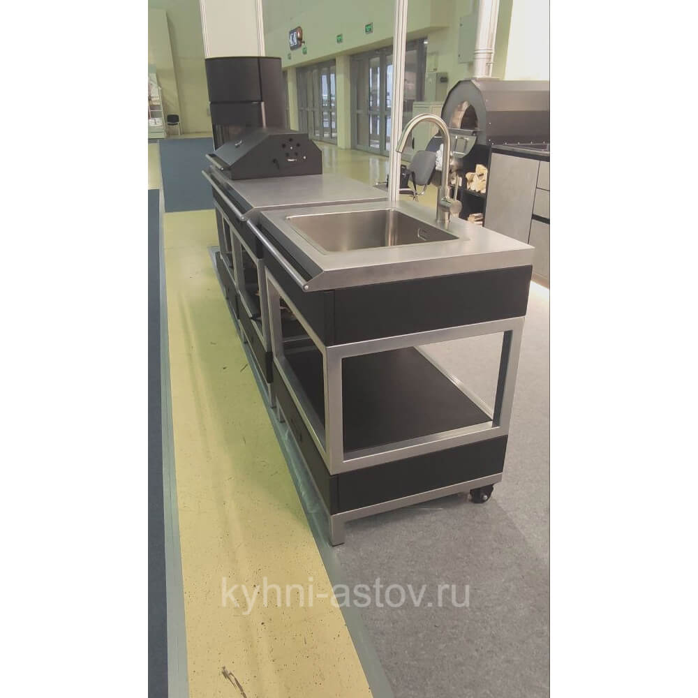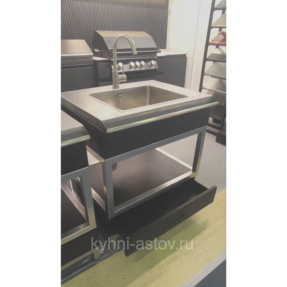 Материал корпуса – комбинированный: черный металл + нержавеющая сталь. Каркас покрашен порошковой краской с эффектом полированной нержавеющей стали. Столешница: брашированная нержавеющая сталь. Мойка накладная Смеситель и мойка не входят в комплект!