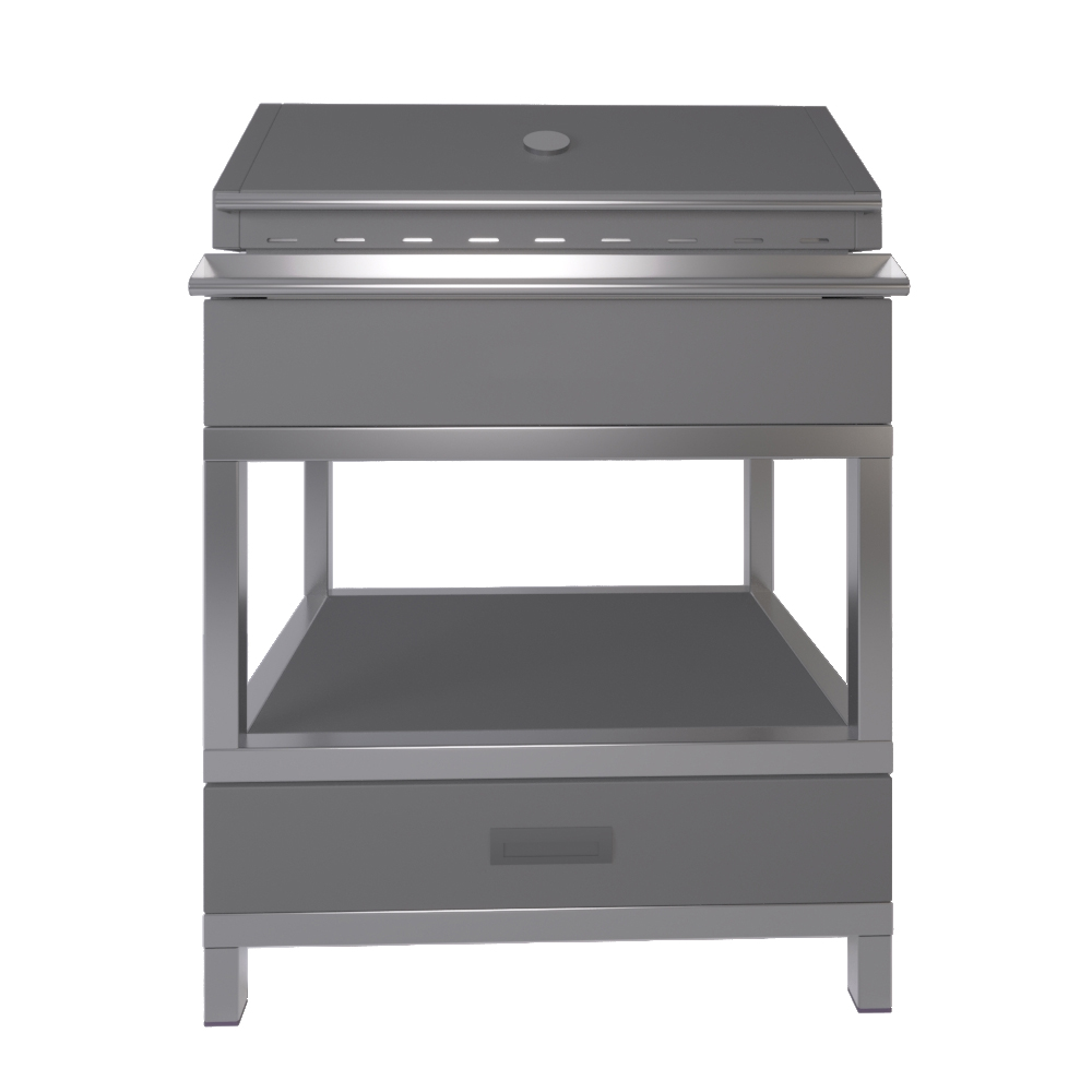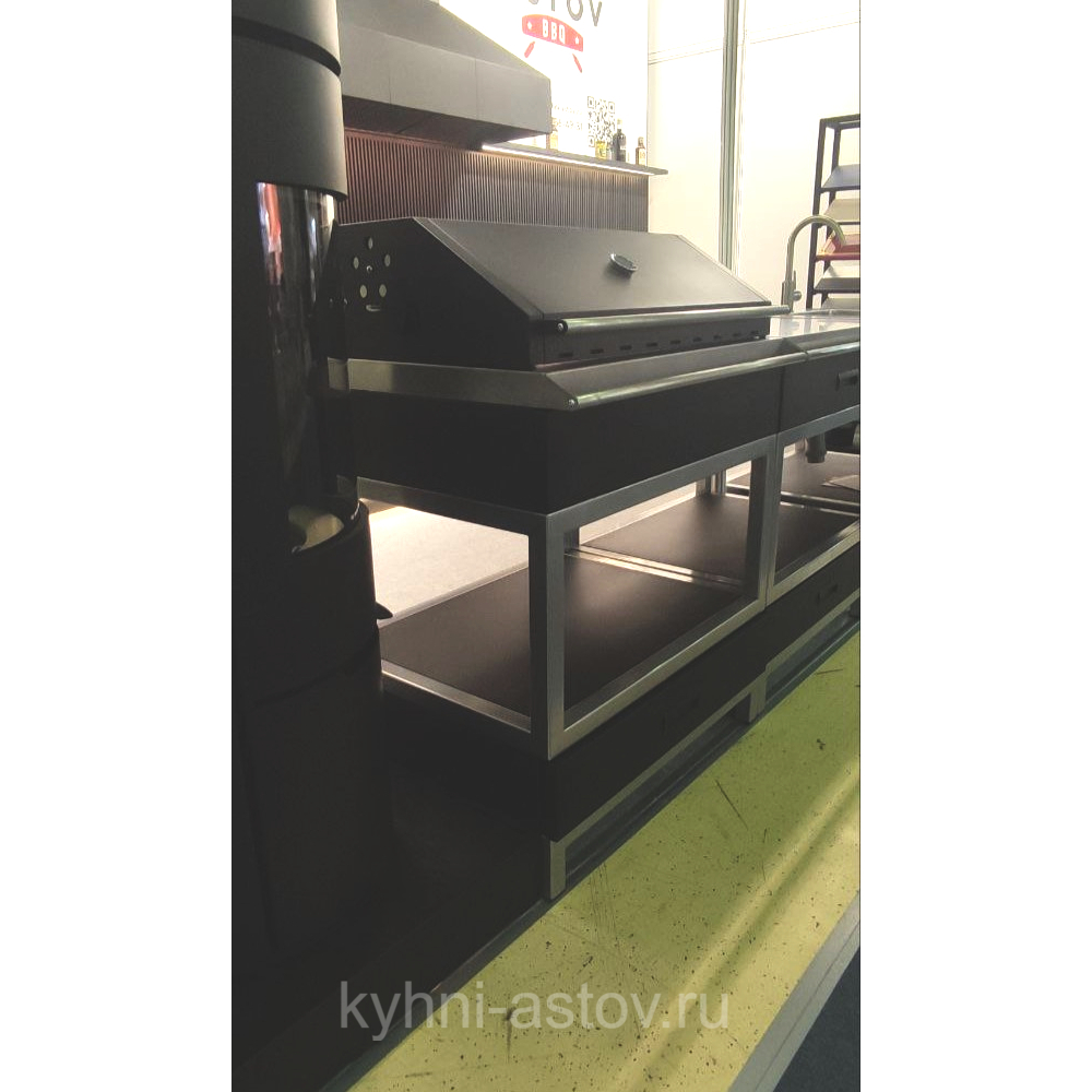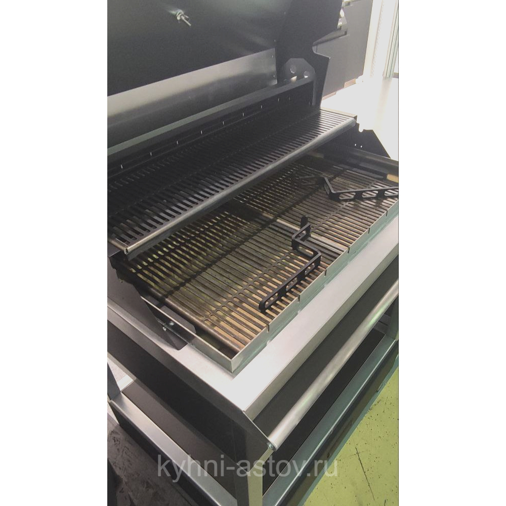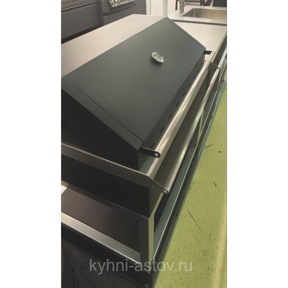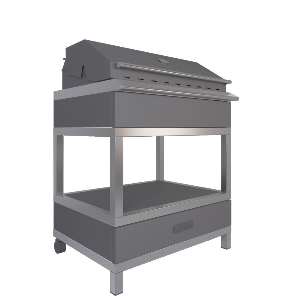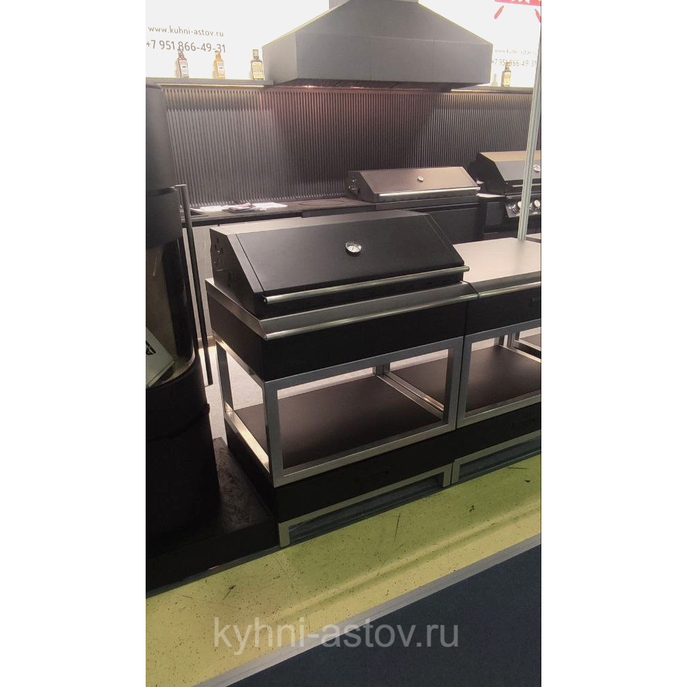 Материал корпуса – комбинированный: черный металл + нержавеющая сталь. Каркас покрашен порошковой краской с эффектом полированной нержавеющей стали. Столешница: брашированная нержавеющая сталь. Угольный гриль. Обязательно использовать в качестве топлива древесный уголь!