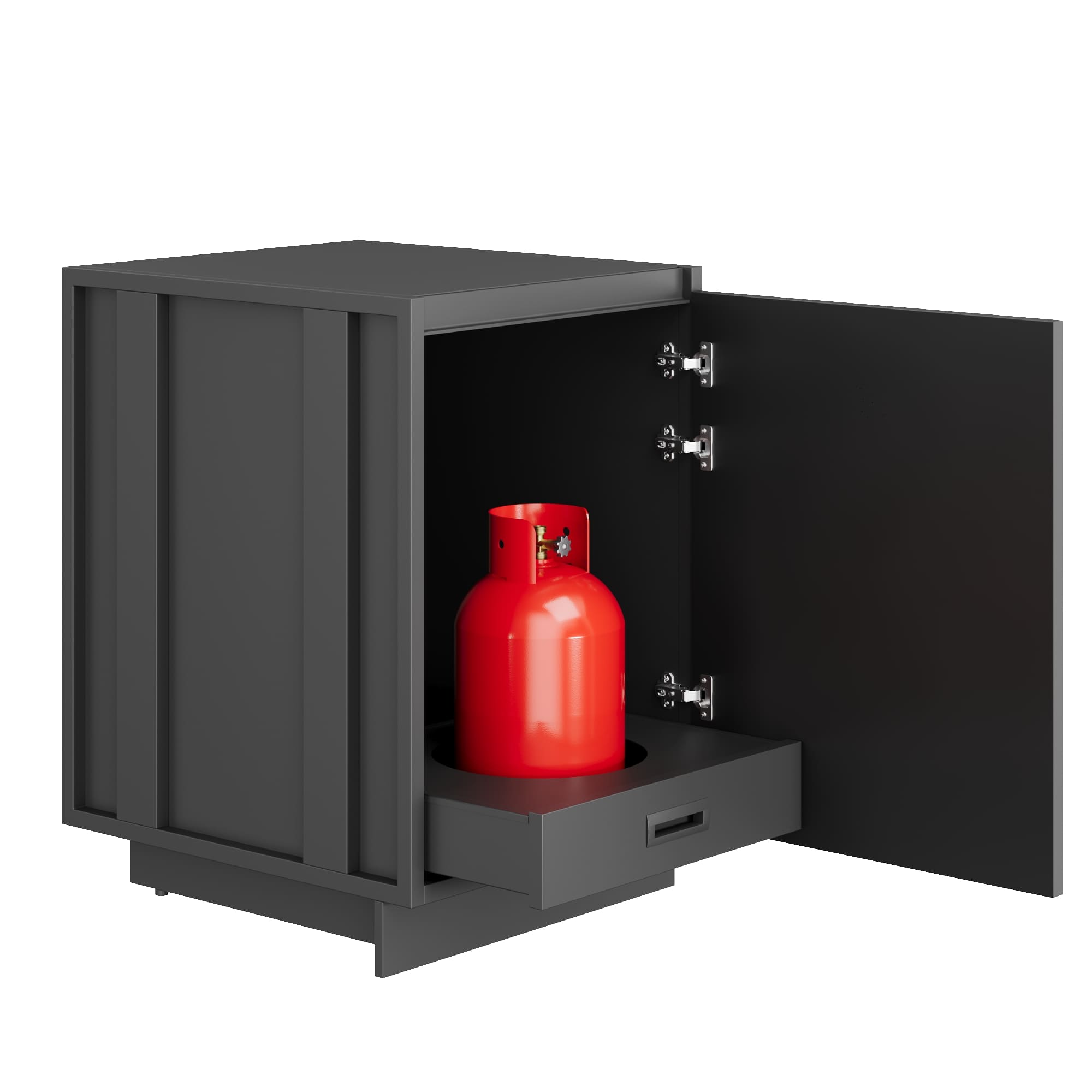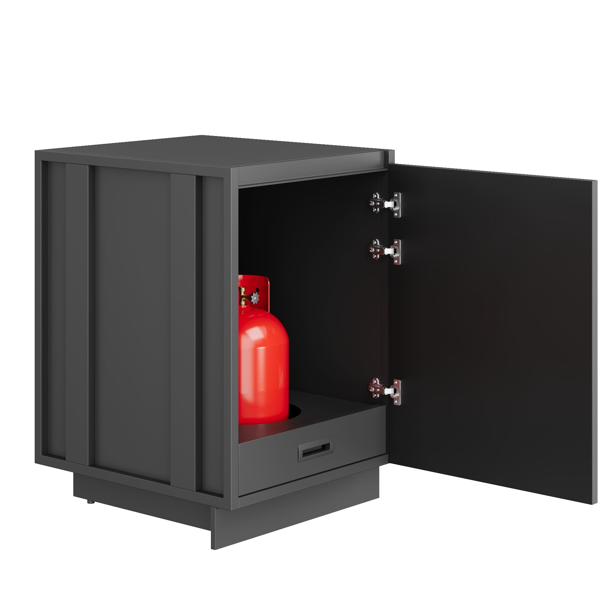 Максимальная высота баллона – 600 мм. Выкатная полка под газовый баллон, диаметр посадочного места баллона 320 мм. Рекомендуемый объем баллона — 16 л. (у разных производителей разные размеры баллонов, перед покупкой проверить) Количество направляющих (BLUM, Австрия) с доводчиком – 1 пара Количество петель (BLUM, Австрия) с доводчиком – 3 шт. (левое или правое расположение) Толщина фасада: — из металла и нержавеющей стали 25 мм. (двухконтурный) — из керамогранита (в алюминиевом профиле) 20 мм. Толщина боковых и задних стенок 25 мм. Регулируемые ножки. Модуль разработан под толщину столешницы 20 мм. Материал корпуса может быть выполнен из нержавеющей стали. Материал фасада может быть выполнен из: — Нержавеющей стали; — Керамогранита (в алюминиевом профиле); — HPL (в алюминиевом профиле).