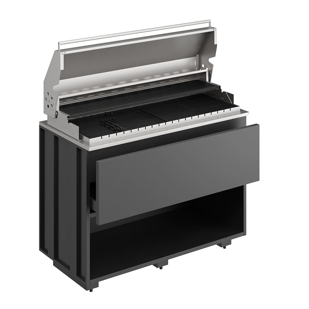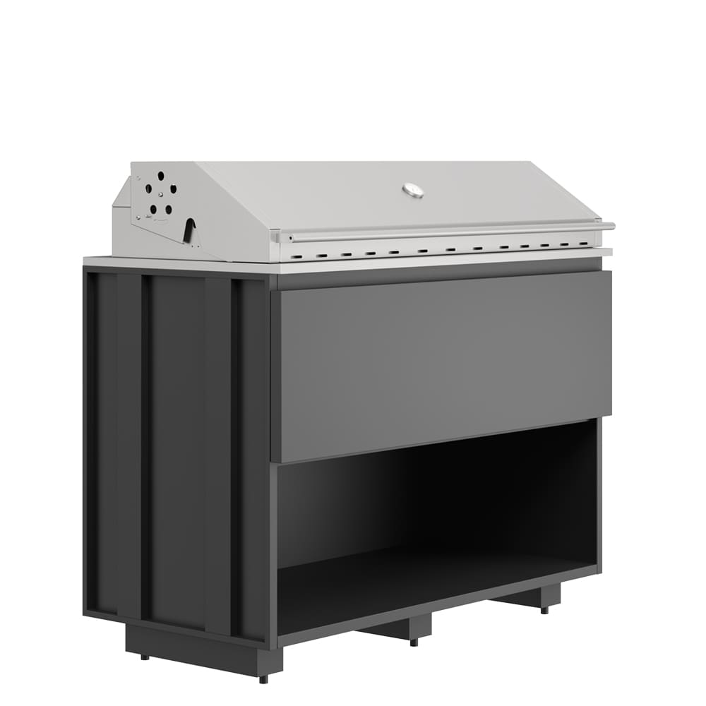 Высота ниши для хранения — 360 мм. Полезная высота выкатного ящика 60 мм. Количество направляющих – 1 пара. Крышка мангала открывается на 100˚. Крышка не будет касаться фартука, если его толщина не больше 30 мм. Толщина фасада: — из металла и нержавеющей стали 25 мм. (двухконтурный) Толщина боковых и задних стенок 25 мм. Регулируемые ножки. Рекомендуемый объем загрузки углей – 50-70% от общего объема чаши мангала. Запрещается использовать дрова! Материал корпуса может быть выполнен из нержавеющей стали. Материал фасада может быть выполнен из: — Нержавеющей стали.