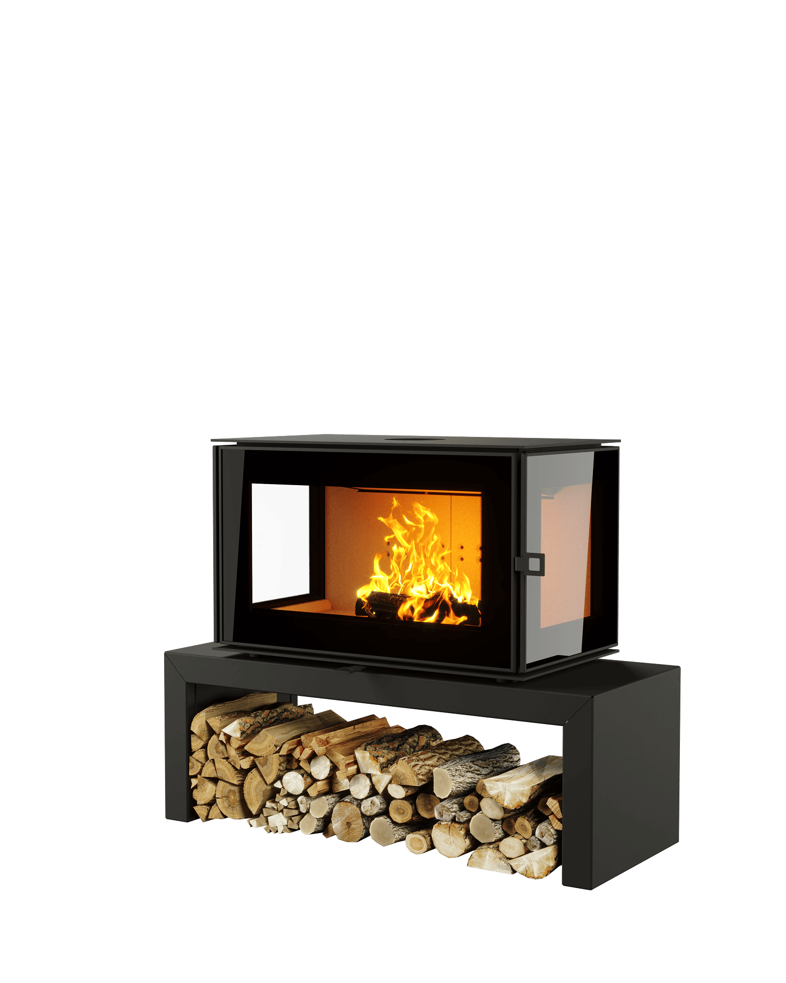 Боковые стенки печи-камина КУБ 3С 800 имеют двойное остекление и обеспечивают панорамный обзор на пламя.